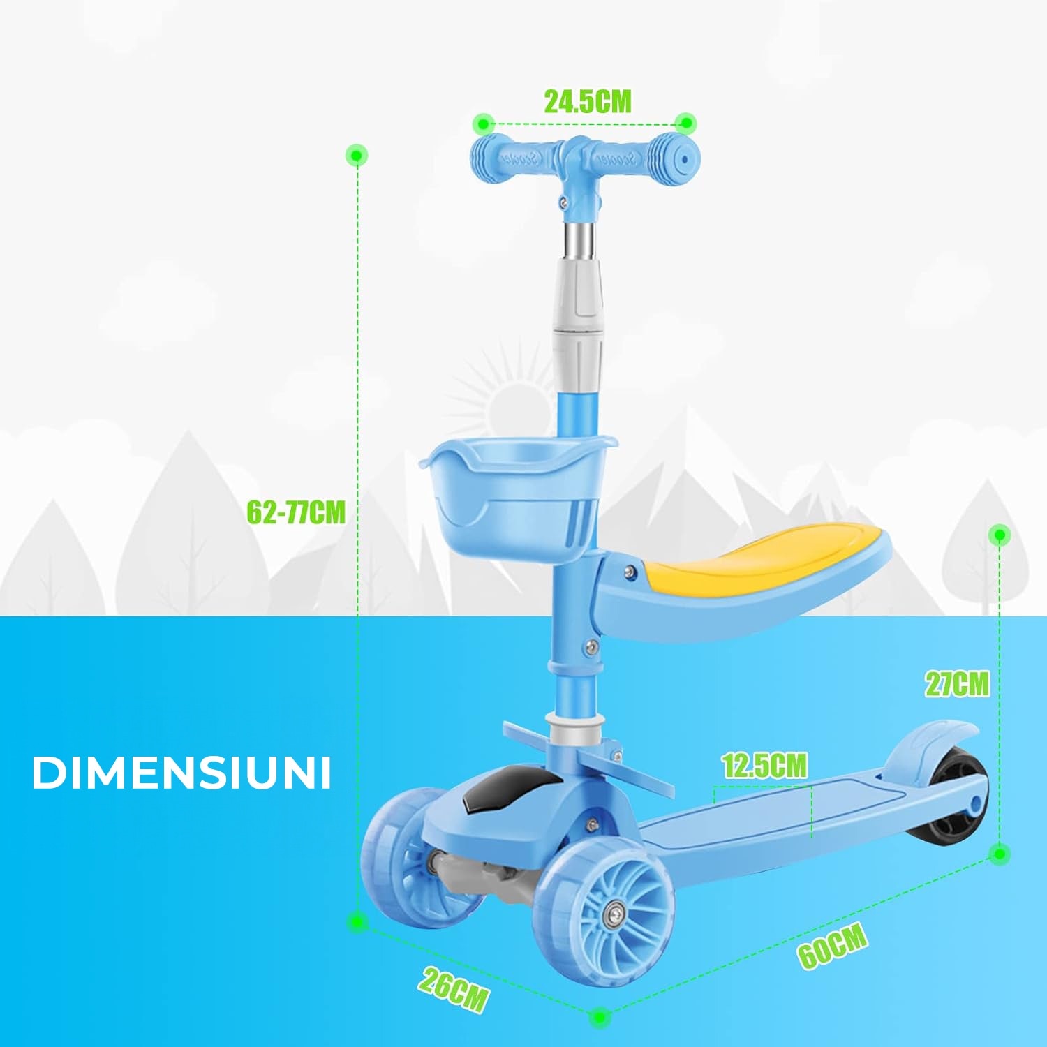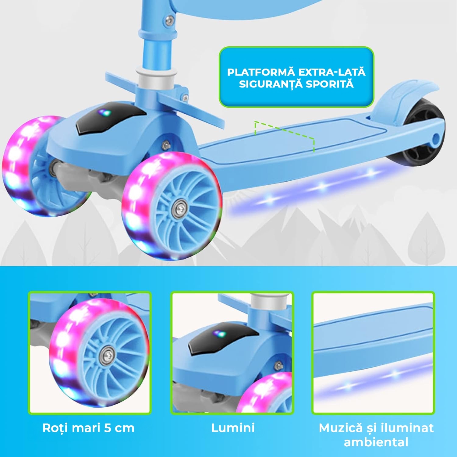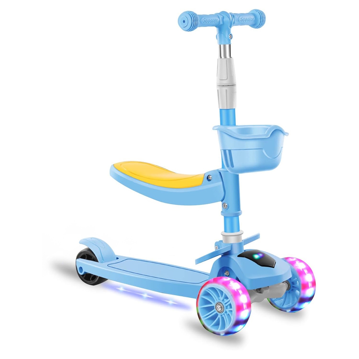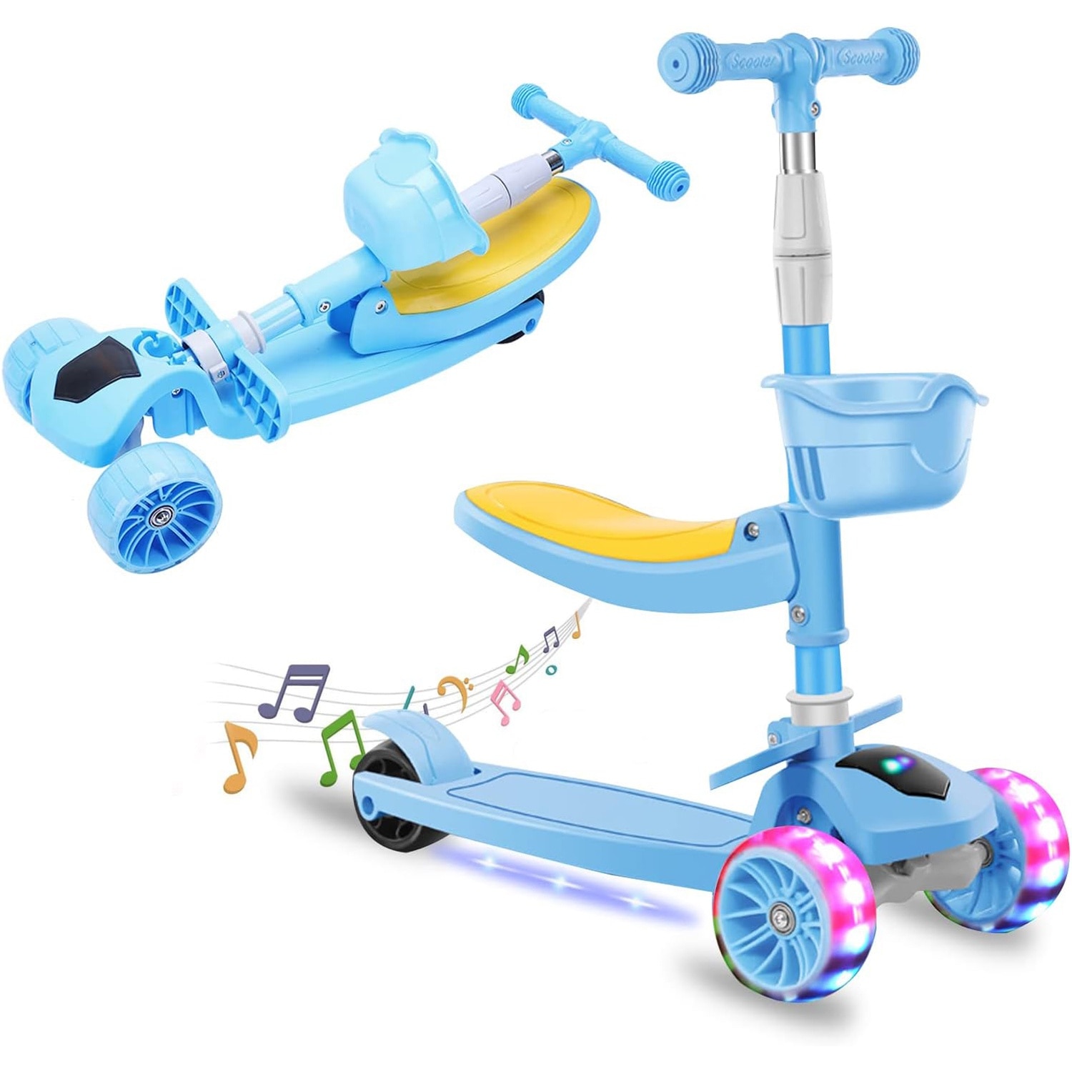 Детска тротинетка със седалка, кабриолет 2 в 1, с LED светещи колела и музика, 2-12 години, до 100 кг, накланящо се кормило, нехлъзгаща повърхност, Синя