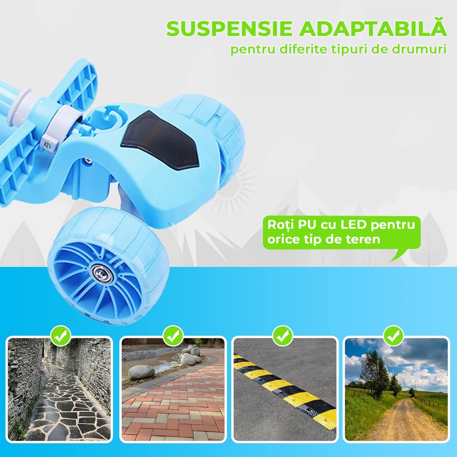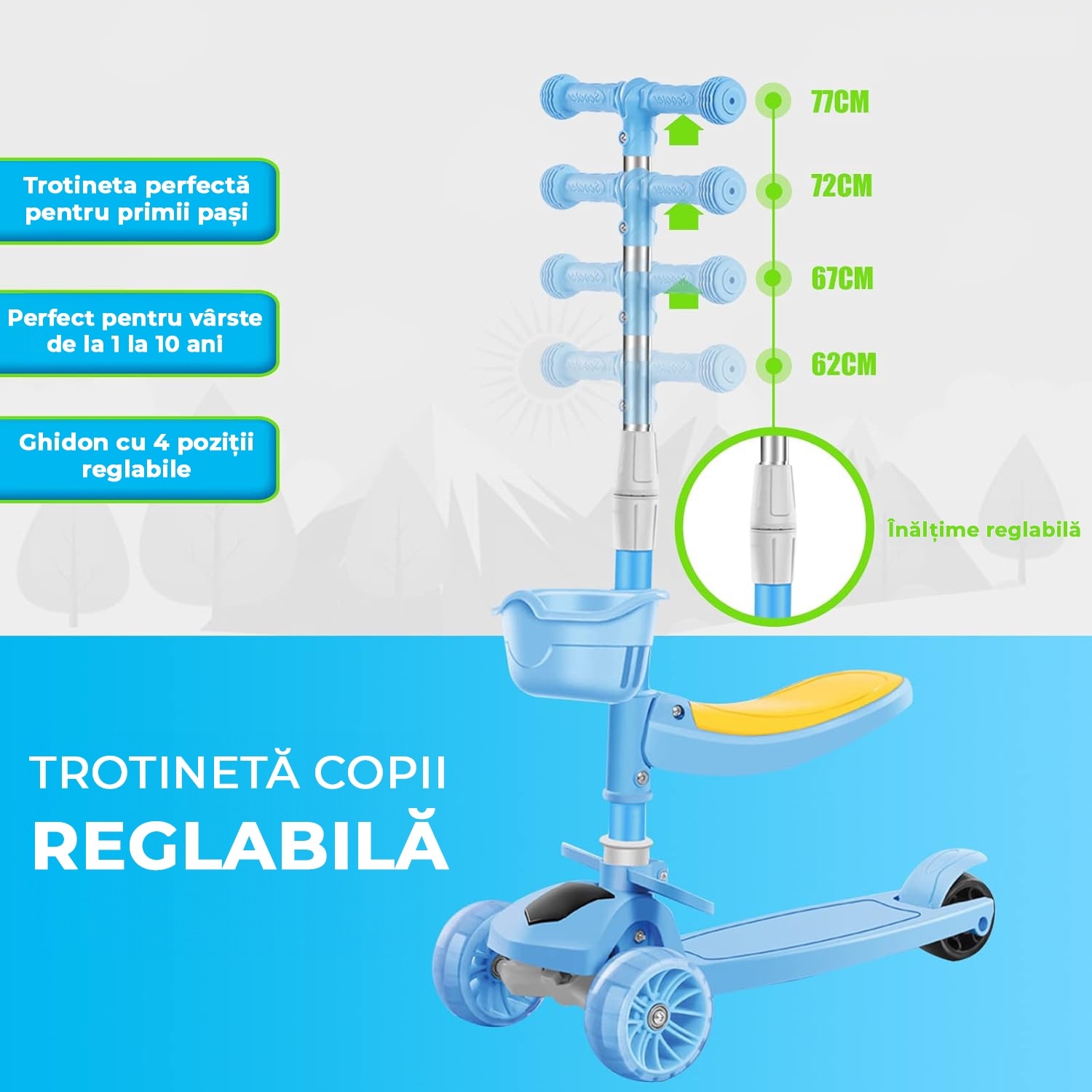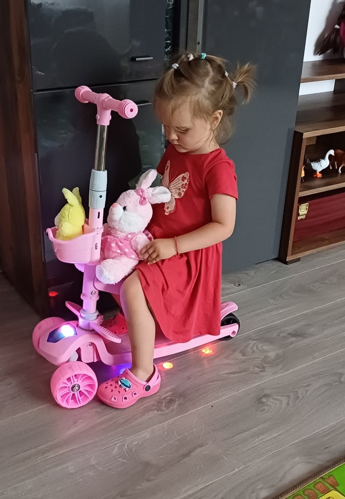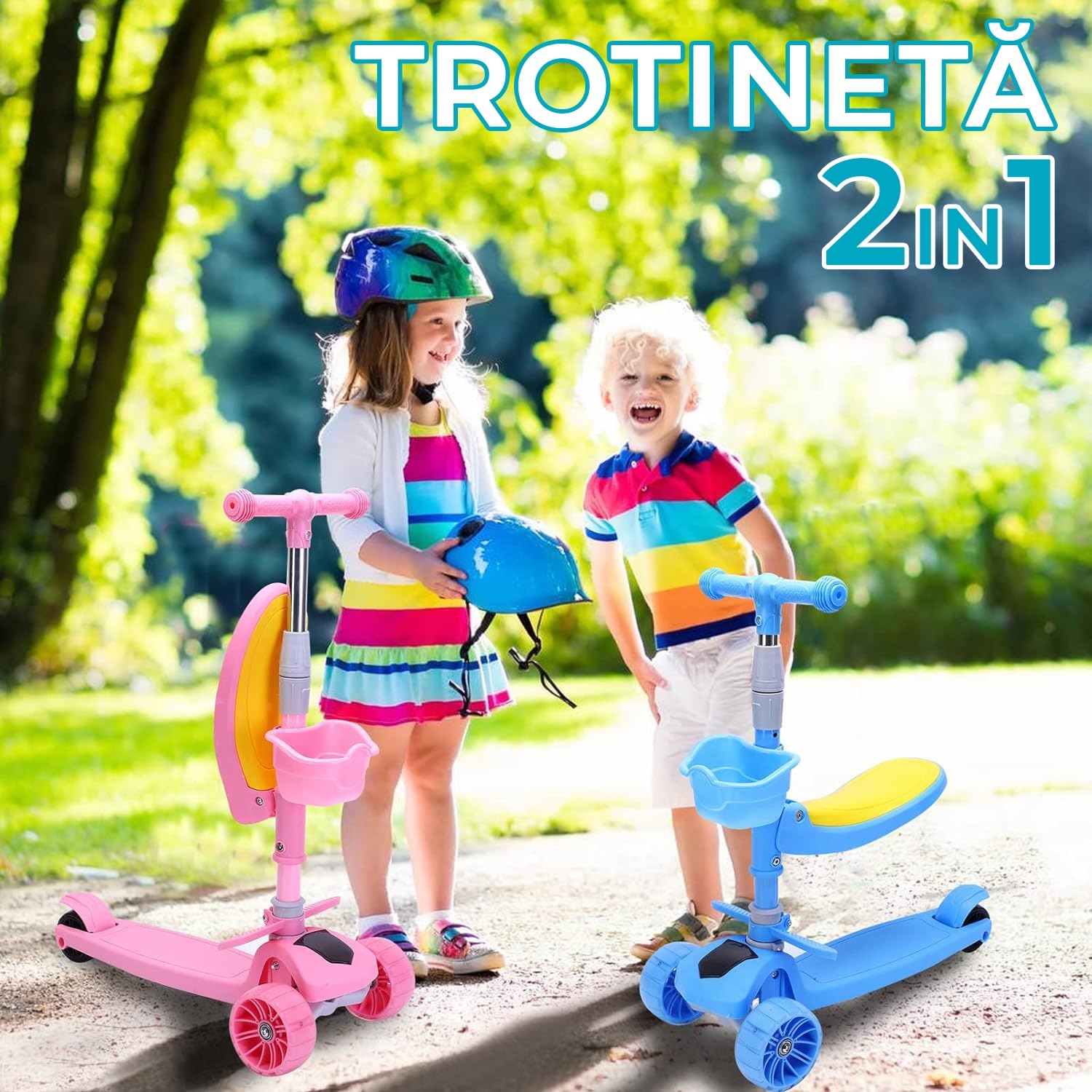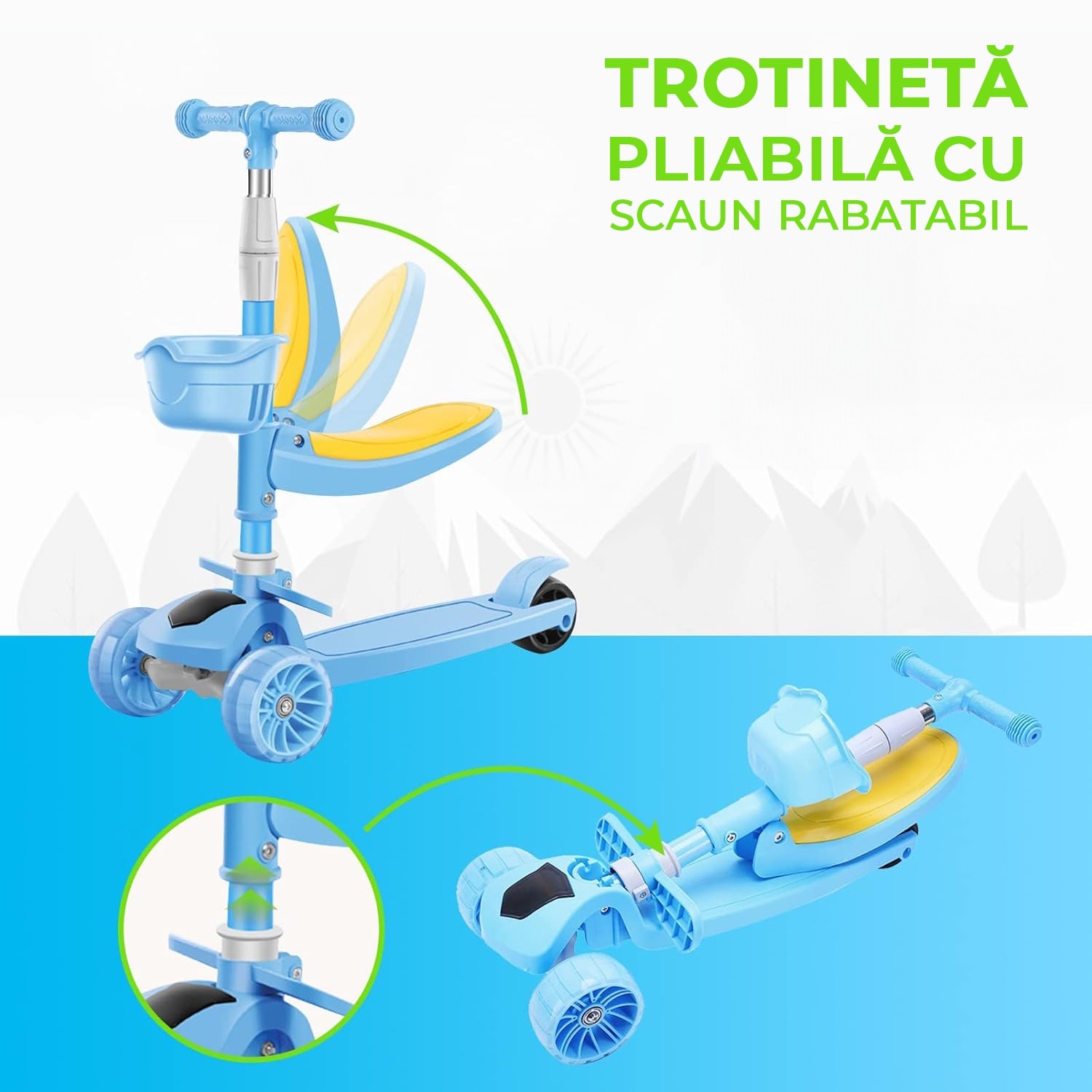 Детска тротинетка със седалка, кабриолет 2 в 1, с LED светещи колела и музика, 2-12 години, до 100 кг, накланящо се кормило, нехлъзгаща повърхност, Синя