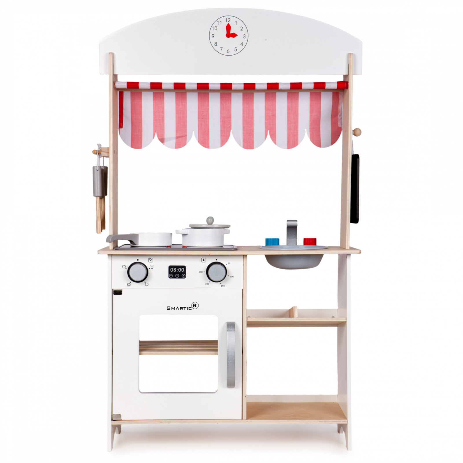 Дървена кухня за деца Smartic, 2 в 1,Със Звуци и светлини, Печка, Мивка, Аксесоари, Бяло/Червено