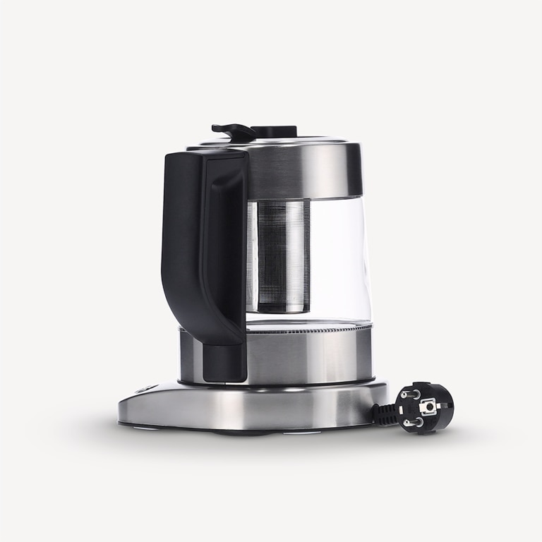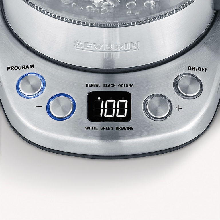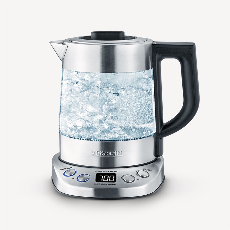 Електрическа кана с инфузер за чай Severin, стъклен съд 1 литър, 5 програми за приготвяне на чай, 2200 W, бързо нагряване, контролен панел, функция Keep Warm, звуков сигнал, инфузер от неръждаема стомана, неръждаема стомана