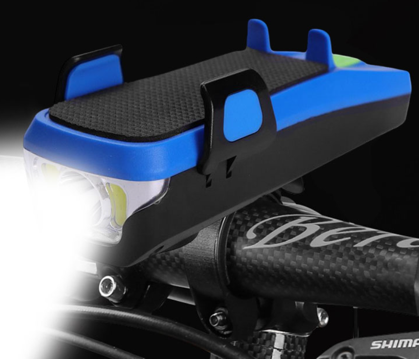 Фар за велосипед с държач за телефон, клаксон 130dB, Power bank 3000mAh, 3 режима на светене, 2 x T6 LED, водоустойчив, син