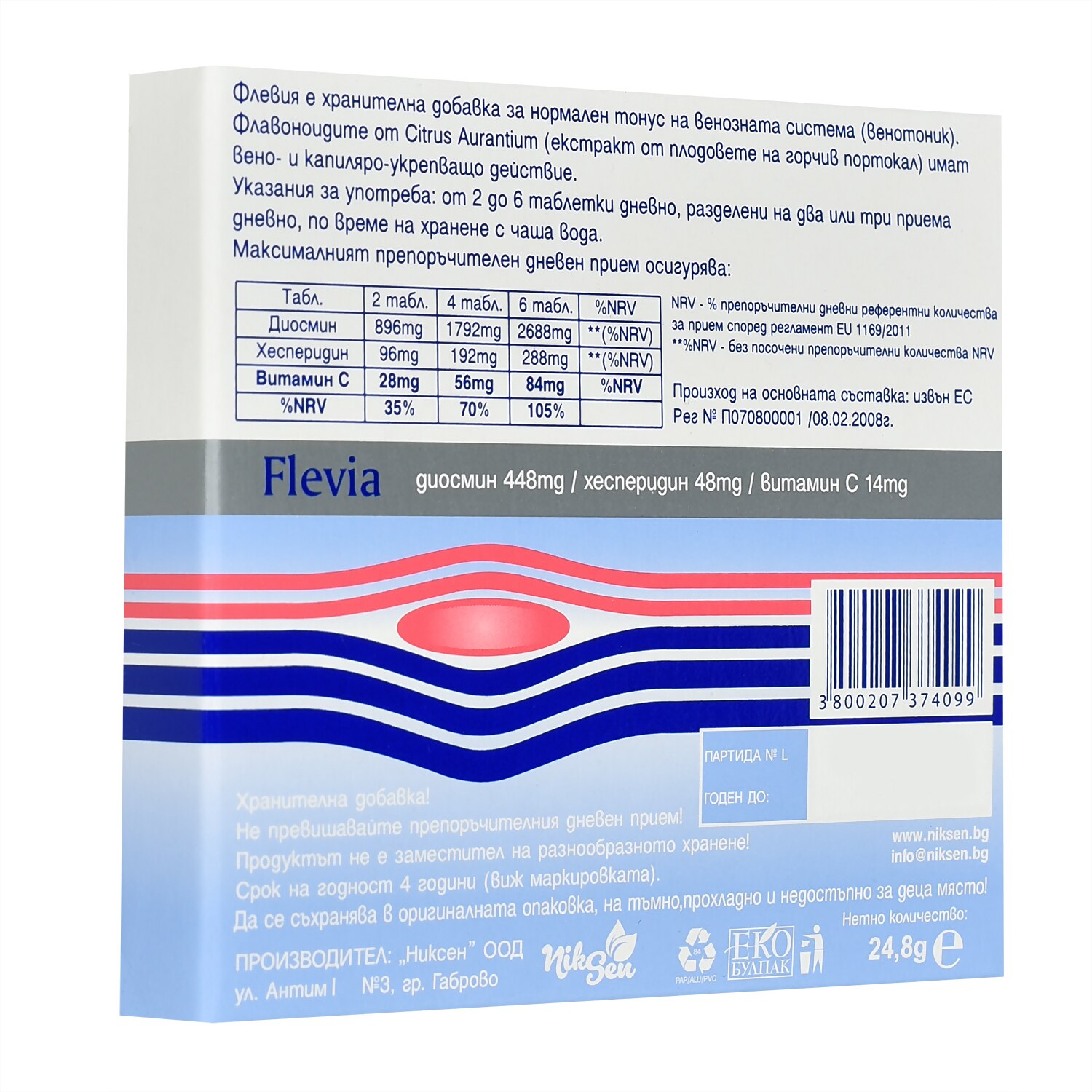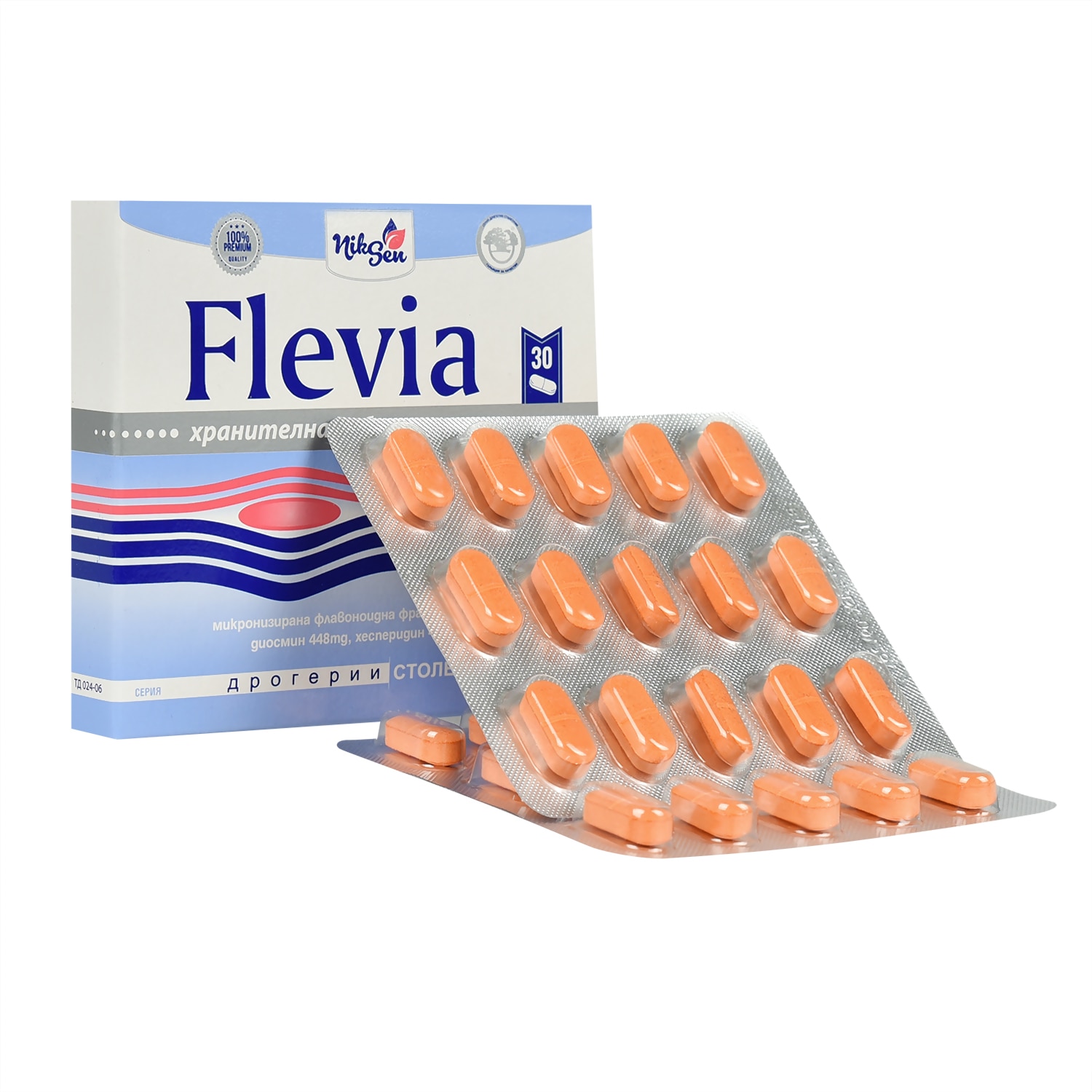 Флевия (повишават тонуса на венозната стена и намаляват пропускливостта на капилярите, при болки и тежест в краката, при разширени вени, периферни отоци и хемороиди) НИКСЕН, 30 таблетки