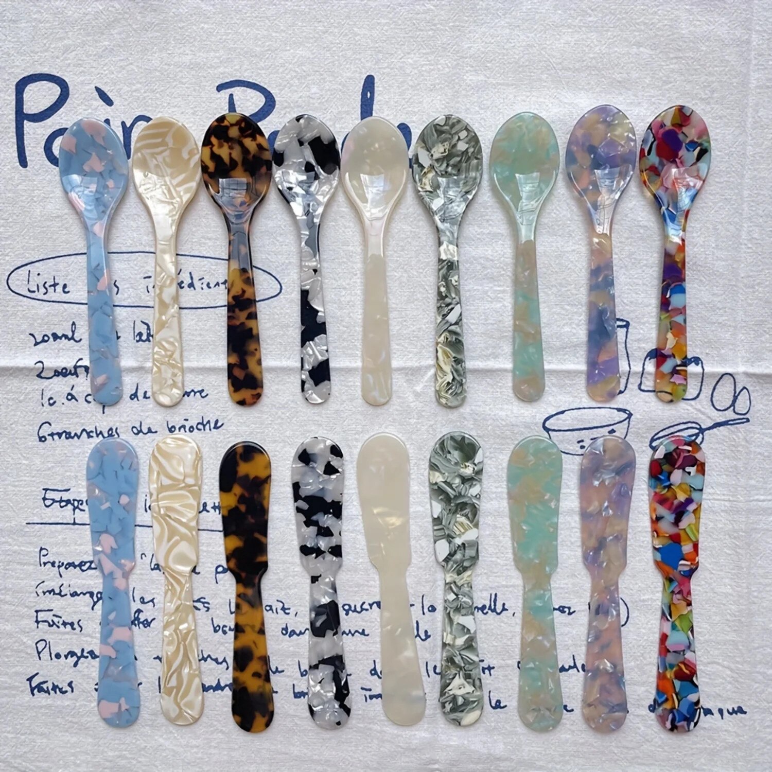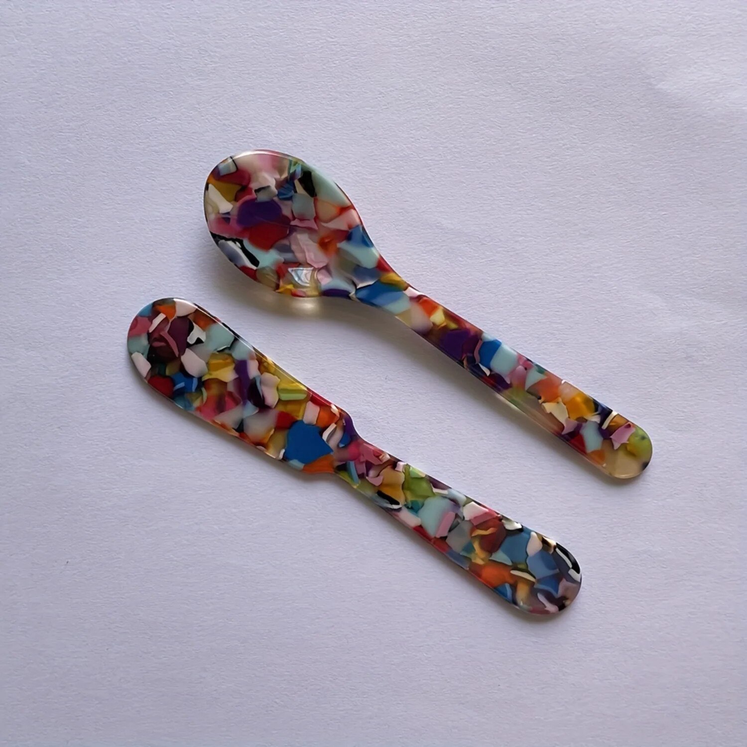 Комплект прибори за хранене от ярък акрил 11 см, с ножове за масло и десерт, лъжици за лед и хайвер, лъжици за смесване, многоцветни