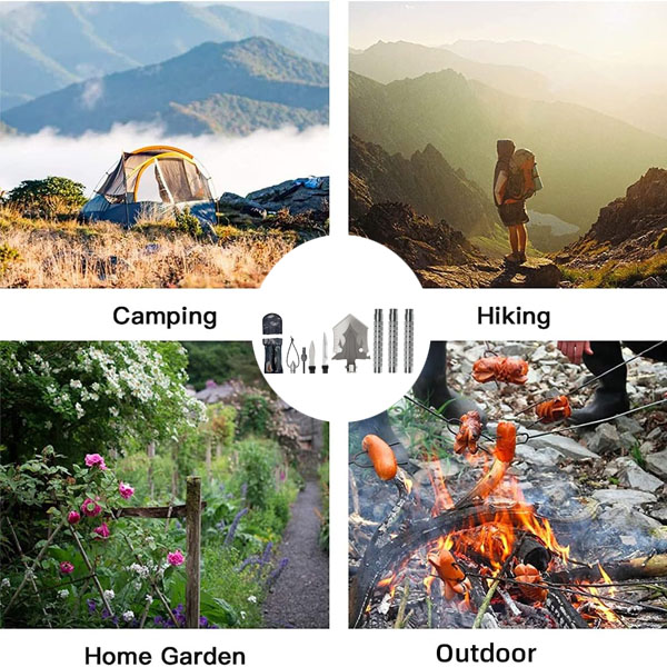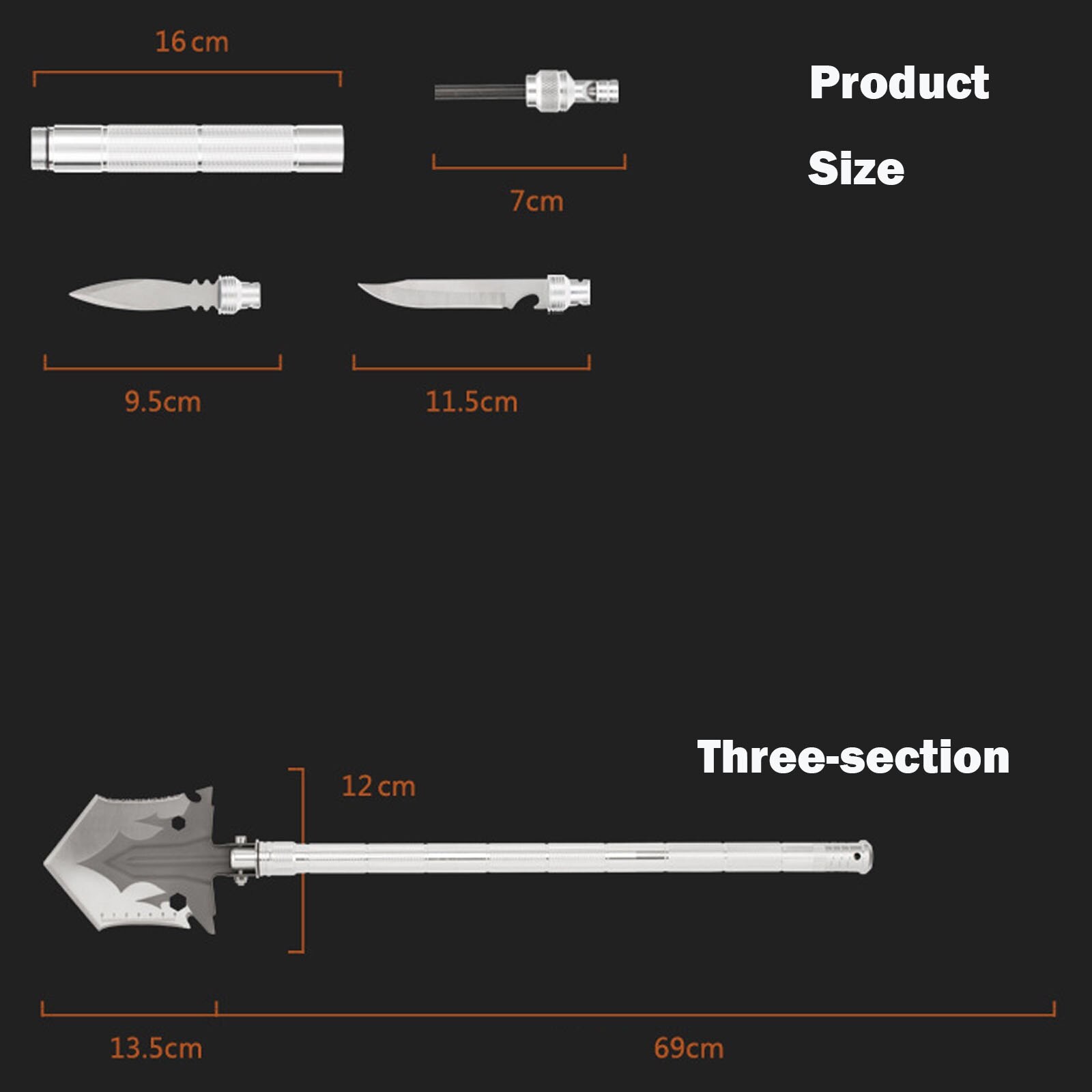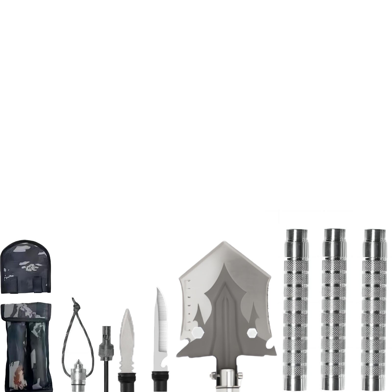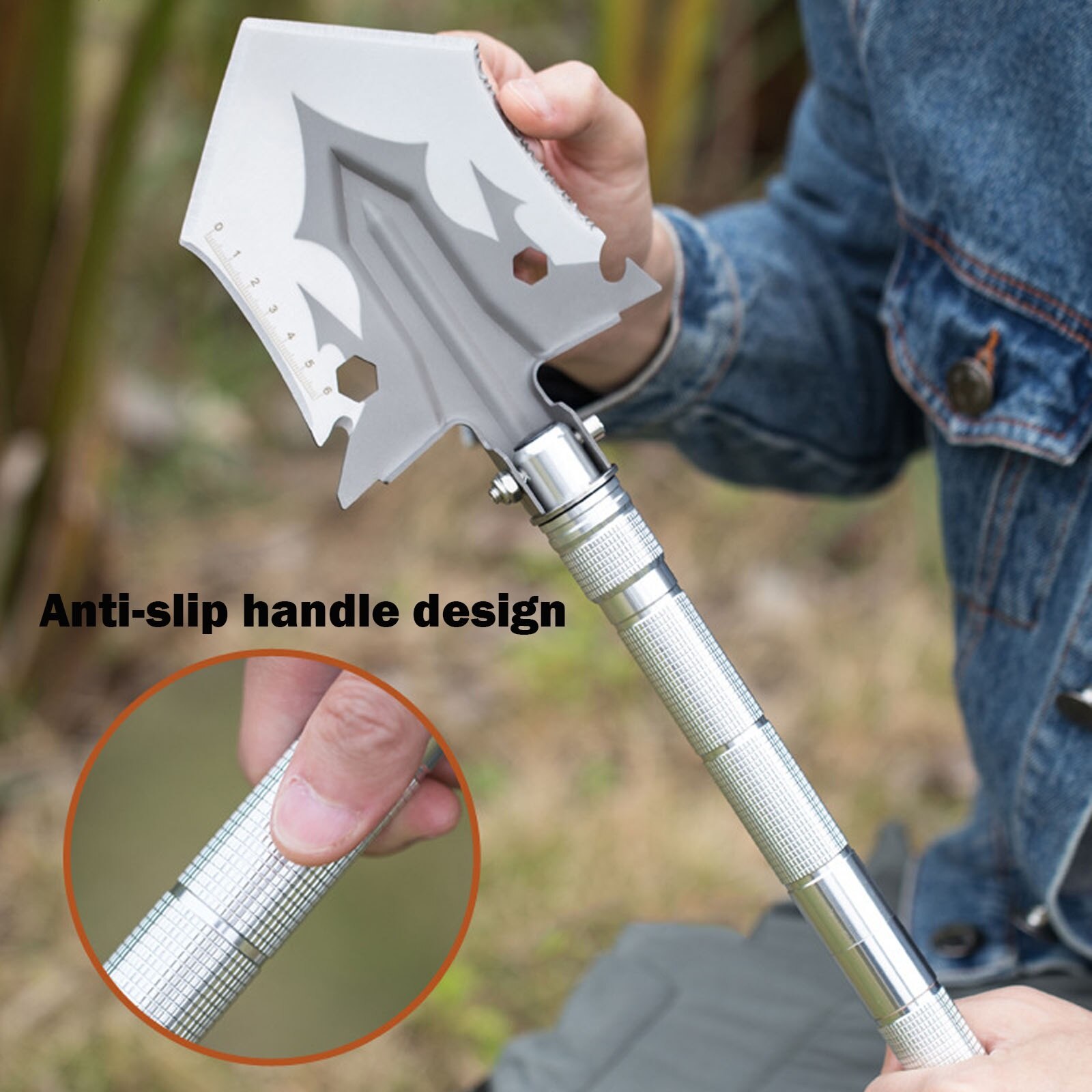 Многофункционална сгъваема лопата, SINBINTA, с 3 нехлъзгащи се дръжки, чанта за съхранение, нож, връх на харпун, свирка, Сваляща се, За къмпинг, оцеляване, спешни случаи и др., Метал, 69*12 см, Сребро