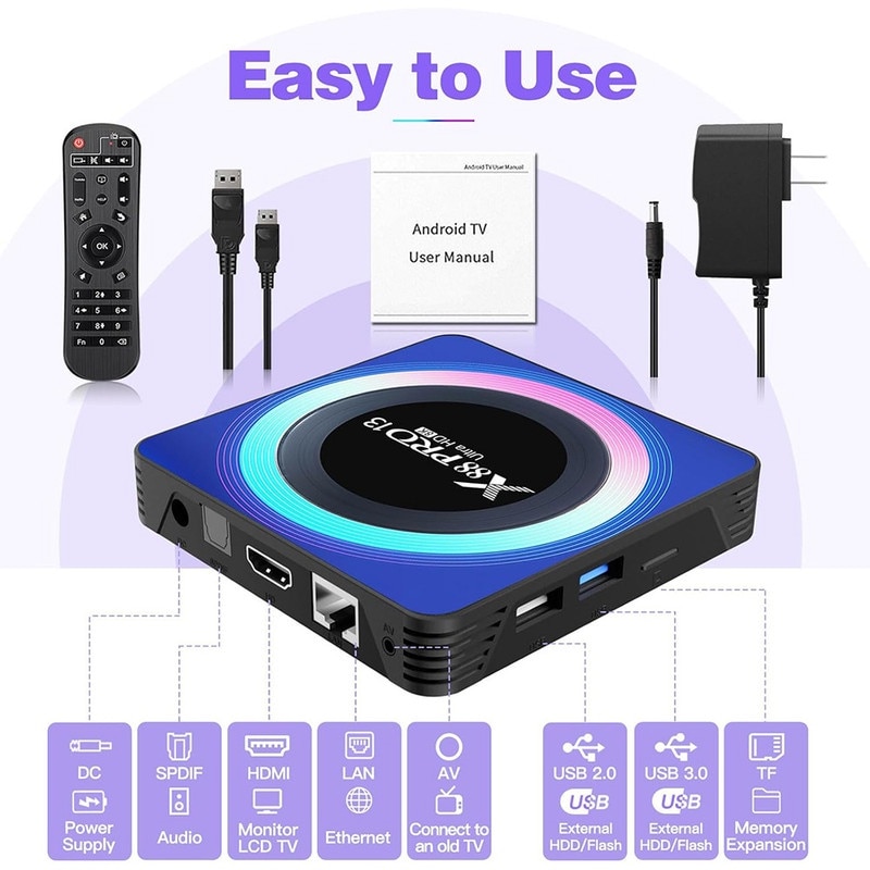 X88 PRO 13 поддържа двубандов Wi-Fi 6 (2.4GHz/5GHz), с теоретична скорост на предаване до 1.2Gbps, около 30% по-висока от Wi-Fi 5, осигурявайки плавно възпроизвеждане на онлайн видео и ниска латентност за интензивни игри. Оборудван с технология Bluetooth 5.0, той осигурява по-стабилни връзки за безжични клавиатури и мишки, слушалки или игрови контролери, разширявайки обхвата на предаване. В допълнение, той предоставя 10/100Mbps Ethernet порт, за да отговори на нуждите на кабелната мрежа, подходящ за потребители, които изискват висока стабилност на мрежата. Двата USB порта (USB 3.0 + USB 2.0) позволяват свързването на външни USB устройства, твърди дискове или 4G мрежови карти, осигурявайки отлично разширение.