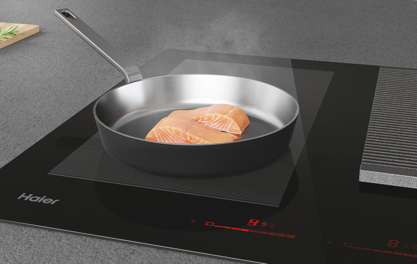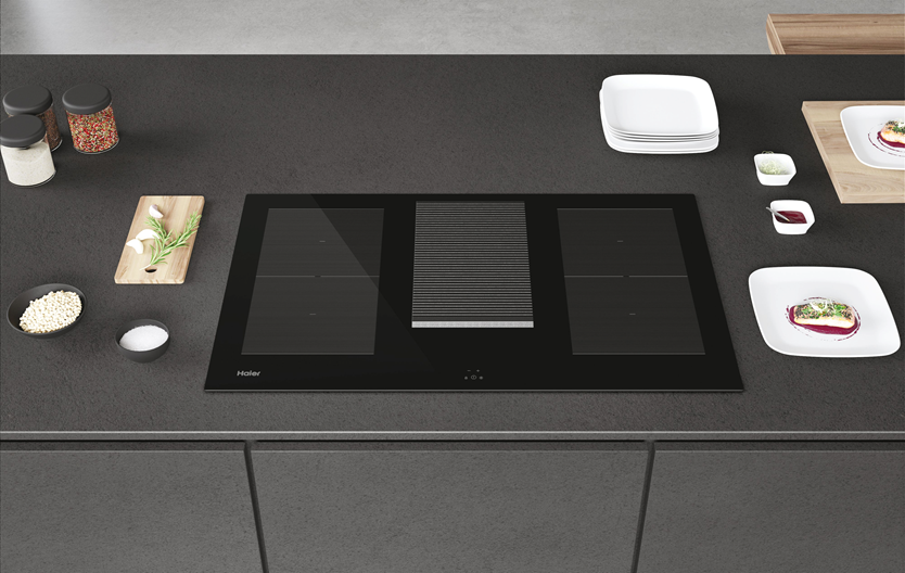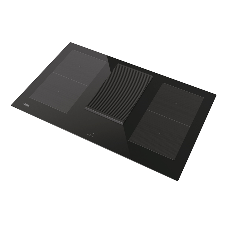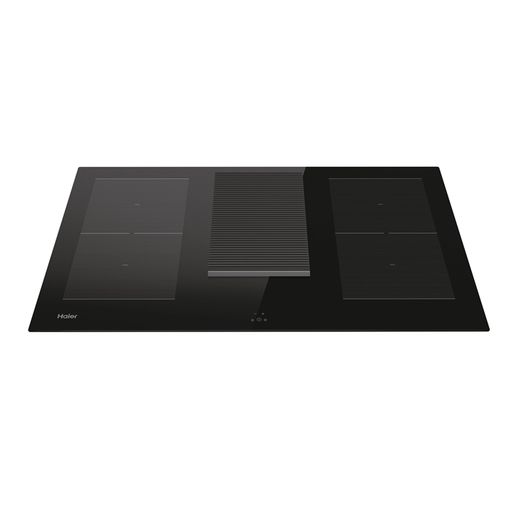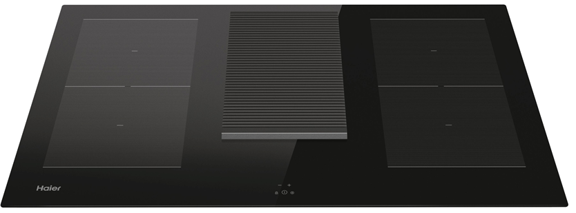 Плот за вграждане с включен абсорбатор Haier HAIH8IFMCF, Индукция, 4 зони за готвене, Зона с двоен мост, Сензорно управление, Индикатор за остатъчна топлина, Таймер, Бустер, Автоматично нагряване, Рециркулационен аспиратор, Клас А, 80 см, Черен
