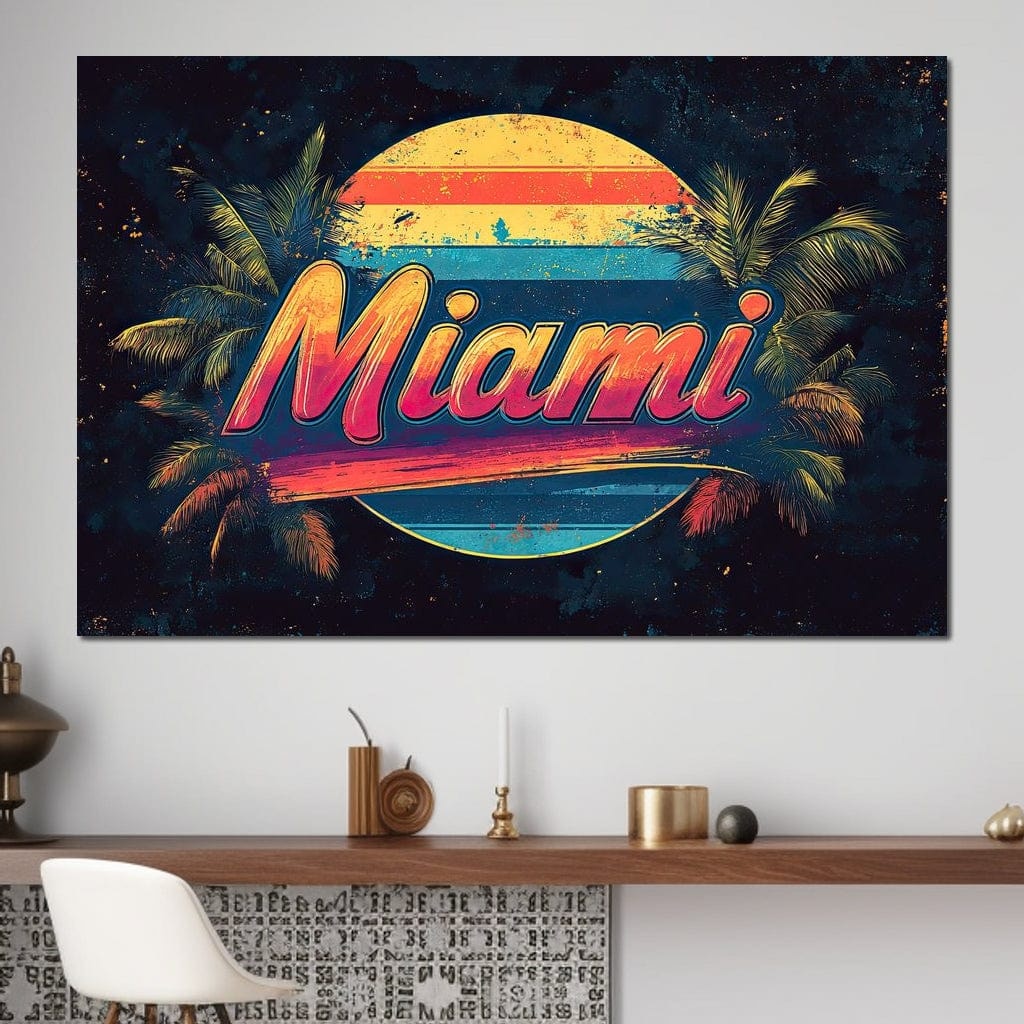 Първокласна картина на платно, LuxCanva® F1013, Изживейте мечтата на Маями, 40 X 60 CM, 100% памучно платно 400g/m2, Дървена рамка, Слънце, Град, Релаксация, Забавление, Реколта, Вибрация, Всекидневна, Офис, Живи цветове